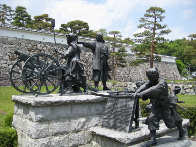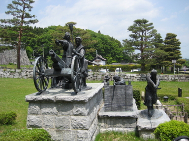 二本松少年隊(隊長・木村銃太郎と隊士たち)のブロンズ像。写真左の後方に写っているのは、我が子の出陣服を仕立てる母の像。(←この像もちゃんと撮ればよかった……)
