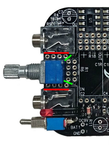 基板上のスペースが狭いためボリュームに隣接するR2, 6, 7用のソケットはそのままでは装着できません。まず、入力抵抗(R2, 7)はステレオミニジャックと接触する部分(図中、赤線)を平ヤスリで削ってください。このとき、ボリュームと接触する側は削らないようにしてください。その次に、フィードバック抵抗R6と接触する部分(図中、緑)を削ってください。