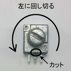ボリュームは回り止めをニッパーで切断し、左(反時計回り)に回しきってください。