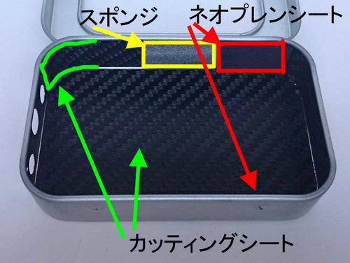 ネオプレンシートは、ハサミで半分(17mm×25mm)に切りケース内側側面の006P電池が接触する部分に貼り付けてください。