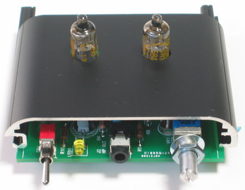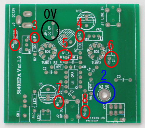 2013/02/28頃出荷分より、部品をTable 0の様に変更します。R3, R8は真空管とオペアンプの間にあるハイパスフィルターを構成する抵抗で、定数を小さくすることでオペアンプの動作が安定してノイズが減ります。ただし、小さくし過ぎると真空管の動作が不安定になったり、低音が遮断されたりする副作用もあります。ボリュームはローレットシャフトタイプにして組み立て時の手間を省きました。皿タッピングねじは黒でも導電性があることを確認したので4本とも黒にしました。