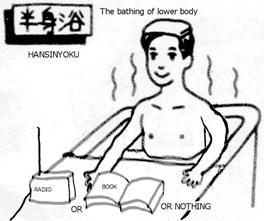 胸から下だけをお湯に入れます。肩は入れません。(手は入れても入れなくても良い、但し、ぬれたまま外に出すと冷えるのでタオルで良く拭く)