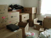 引越の船便が到着。 途方に暮れる・・・ すごいことになっているので、写真はちっちゃくね。 |