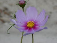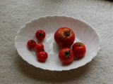 裏庭のトマト。 トムはトマトが大好き。 10本ばかりもミニトマトを植えている。 私がまいた花の種の上から植えたため、トマトの間から、コスモスなんかが生えてきている。 |