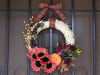 気分はハロウィン。ハロウィン用のリースってオレンジ色が基本なのね〜。 本物のカボチャをさしてあるんだけど、当日までもつかどうか怪しい。 |