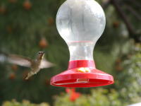 いつもお腹を空かせているハミングバード。羽ばたく回数がとても多いので、エネルギー消費も半端じゃないとか。 おかげで手の届きそうな距離にいても、飛んでくる。 |