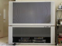 うちにプロジェクションテレビが来た。それも、56インチの超デカテレビ。どのぐらい大きいかというと、テレビ台の下のスペースに、ビデオデッキとDVDデッキを仲良く並べて置けるほどの横幅がある。パソコン机がちらっと映っているから、高さもだいたい分かると思うけど、もはや部屋の主である・・。音はすばらいし、デザインもよくて部屋の中がすっきり見えるんだけどね(笑) ただ、大きさは前のでも、十分だったんだけど・・。今住んでる所そんなに広くないので、このテレビ見るのに後ろの壁にへばりついている(笑)嬉しいやら悲しいやら・・・。 |