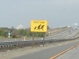 これ・・・。サンディエゴから、ロサンゼルスに向かうフリーウェイの、ちょうど郡境あたりに立っている標識。「注意」と書かれ、その下に大人二人、子供一人が走っている姿が。何に注意かって言うと、つまり、メキシコからの不法入国者が、逃亡中にここを走って横断するかも知れないから注意、ということなのである。 子供連れって所が生々しい・・。さすがメキシコ国境に近い町。特にこの辺は人家もなく、ボートでこぎ着けるには格好の場所。でも・・・実物にお目にかかりたくはないもんだ。 (ちなみに、最近は警察の監視の薄い内陸の何とかって砂漠(荒野?)を大勢で押し渡る不法入国が増えているそうである。) |