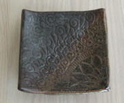 厚手の皿。5"×5" 記念すべき1作目。 作成: 2004年1月の終わり。 粘土: 黒。 釉薬: メタルブラック、T's Green HB3さんに、センスがあるとほめられた☆ |