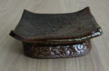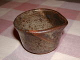 花小鉢。 作成: 2005年5月 粘土: 赤(Amador) 釉薬: Tin mamo この釉薬を使ったのは初めて。つや消しの茶色、と言う感じ。 素焼きの段階まで、どーでもいい小鉢だったけど、仕上がったのを見ると、意外によかった(*^_^*)。釉薬の魔法〜 |