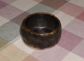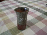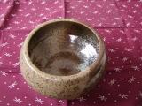 焼酎碗。 作成: 2005年4月 粘土: 白(詳細不明) 釉薬: Metal Black Tomの記念すべき第1作。私がコツを伝授したため、私の手びねり第1作より全然まとも。 ただ、Metal Blackの輝きが少々鈍いのが残念。 |