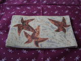 皿。 作成: 2005年3月 粘土: 赤(Amador) 釉薬: Metal Black, Ohata Kaki 下の皿と同じ手法で作った皿。これはTomが釉薬かけた。 筆で塗ったためか、少々むらが目立つ。 |