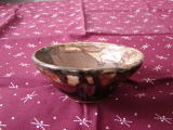 小鉢。 作成: 2004年12月 粘土: 白 釉薬: 全体に、おそらくMargie's oil spot。縁にT'sgreen。 お茶碗になるかな?というぐらいの大きさに作ったつもりだったのに、焼き縮んで、せいぜい醤油皿といったところ。しかも釉薬が妙な具合に流れてしまって、所々地肌が出てしまっている・・。 |