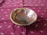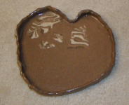 茶碗? 作成: 2005年1月 粘土: 赤(Amador) 釉薬: Porcelain Clear Under Graze Pencilで、釉薬の下に羽模様を描いてみた。でも、縁が低くてあんまり見えない・・。 |