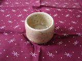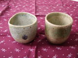ぐい飲み。 作成: 2004年12月 粘土: 白 釉薬: T’sGreen ぐい飲みばっかり作ってどうする(笑)それも釉薬T'sgreenばっかり。 これは、底の高台を削りすぎて穴が開いたのを、上から別の粘土で埋めたため、もうボロボロ。水が漏りそう。陶芸教室に寄付(笑) |
