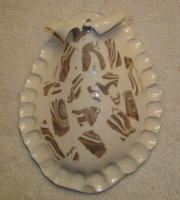 皿。 作成: 2004年12月 粘土: 白 釉薬: Z4Green、Ox-red Z4greenの調子が悪くて、ほぼ白。そしてまだら。 HB3さんのまねをして、下に濃いめの布を引いてみたけど、それでごまかせるってもんでもなかった・・。 |