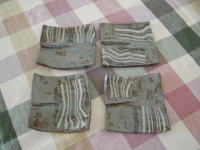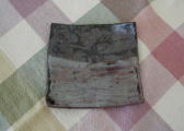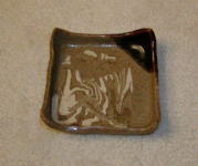 | 厚手の皿。5"×5" 見た人みんなが、「漬け物入れるのにぴったり」と言った・・・。すごく分厚くて重い。 作成: 2004年4月ぐらい。 粘土: 赤(Amador) 釉薬: Oxなんとかとyoung whiteの上から、Z-4_Blueを垂らした。 |