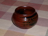 壺 作成: 2005年2月 粘土: 赤(Amador) 釉薬: Margie's Oil Spot 梅干し入れぐらいにしかならないかな・・。 |