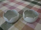 花小鉢。 作成: 2005年5月 粘土: 白(Porcelain) 釉薬: 左:Pocelain Clear 右:Autumn leaf もっと花っぽくしたかったんだけど・・。切れ込みだけじゃイマイチ。TOMに、「灰皿にぴったり」とか言われてしまった・・。ひどい(T_T) でも、色と大きさは理想的。釉薬の差は、写真じゃほとんど分からないけど、Porcelain Clearの方が、ややグレーで、Autumn leafの方が、ややグリーンがかっている。 |