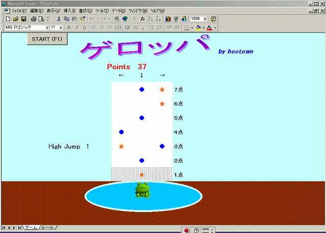 カエルのゲロッパをジャンプさせ上から落ちてくるエサをとり、点数を競うゲーム