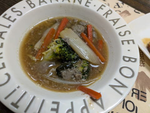 元はネギとつみれだけでしたが、残っていたブロッコリーと人参を足しました。