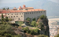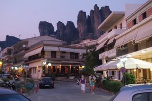 | 4日目 今日も朝から快晴 部屋のバルコニーからメテオラの岩山の全貌が見渡せる 窓の外に見えるカランパカの街並みも綺麗 岩山の頂上に建物が見える どのようにして建てたのか不思議に思えるが ホテルで朝食後 バスで巨岩群への裏側へ回ると そこには広い道路が出来ており 橋や階段を使えば修道院に入ることができる 道の両側にはいろいろな国のナンバーを 付けた車が駐車している 修道院を二か所見学 カランパカの街が眼下によく見える 一番高いところにある修道院へは 270段の階段を登る 昔は手動の昇降機や長い梯子で昇り降りしていて転落事故も多かったようだ 昼食はズブラキというギリシア風の串焼き アテネへ向かう 高速道路は快適 車も少ない 夕食は ヨットハーバーのある海岸のレストラン 紺碧の海と青空 落日が綺麗 映画<太陽がいっぱい>の一シーンと イメージがダブル アテネりの市内のホテルに入る前に アクアポリスの丘に聳えるパルテノンの夜景を見る |