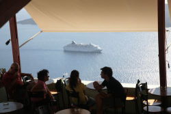 | 7日目 朝食はセブンシーズで 7時にクレタ島上陸 ヨーロッパ最古のミノア文明発祥の地 大きな島 相変わらの快晴に紺碧の海 右手海の中に城塞が見える あまり暑くない 坂の道を歩く 土産物店が並ぶが観光客は少ない まだ朝早いので閉っているいる店 も多い 大きな城壁の下には崩れた石材がごろころと転がって放置したまま そんな中 城塞を後に坂を下り港へ ボーディングパス を見せて11時に船に帰る 皆が一斉に帰るのでエレベーターが混む 昼食後 4時まで部屋で休む 4時45分にテンダーボートに乗り 約10分 サントリーニ島へ 断崖絶壁 300mの島の頂に白い建物が並ぶ 遠くから 眺めると山の頂の雪の様 ロープウエーでフィラの街へ 白い壁 青い屋根 雲一つない紺碧の空 紺碧の海 それ以外の色は無い 沖合にルイス・マジェスティーや他のクルーズ船が停泊しているのが見える 島の北端イオの街へ 白亜の建物 青い丸い屋根のチャーチ 石畳の道 絶景!! ここは紀元前16世紀を中心に繁栄した ミノア文明期の都市遺跡アクロリティーが発見されたことにより 幻の大陸 アトランティスの中心であったとの説がある ここに立てば その説を信じたくなる様な立ち去り難い絶景の地 ここも日本人観光客の姿は見ない 夕食はフォーシーズンで同行の方々と楽しいひと時ほをすごす |