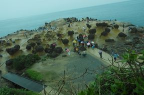 野柳へ 天気予報によると連日雨とのことだったが 四日間で傘を使ったのはこの辺りだけ 海岸に浸食でできた奇岩・