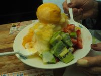 四日目 ホテルでゆっくり朝食を摂り 台湾の下町の繁華街東門へ 若者達で大賑わい その若者達が群がっているのがアイスの店 スタンド席が20人分ほどの店 看板のアイスを並んで注文したら下の写真の様に大盛り 一皿を二人でも食べきれないほど その辺りを散策後ホテルへ 空港への道路は凄く立派 片側2本 合計8~9車線で立体交差 通っている車はほとんど日本製 桃園国際空港の中は凄い人の数だがチェックインはスムーズ A-8ゲートは第1ターミナルにあり 本来ならSKYトレイルだが長い 距離を歩く チャイナエアーA330型機の機内はほぼ満席 チーフアテンダントが挨拶に来た 機内食はステーキと中国料理からの 選択 フライト時間は3時間 入国は行列の人をしり目に自動入国 バッグも一番に出てきて9時47分のミューに乗り10時30分帰宅 |