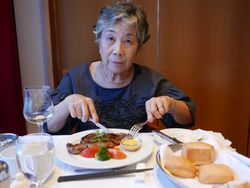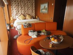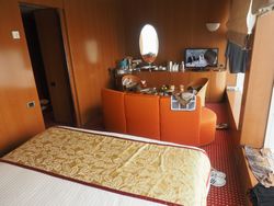 | 1日目 名古屋~金沢 <特急しらさき>で3時間は快適 金沢駅で昼食 タクシーで金沢港へ向かう 埠頭にコスタ・ビクトリアの巨大な船体が見える 乗船券を示し写真を撮り優先乗船 コスタカードをつくり 16時 最上階11階の11111ルームへ バス付二部屋のスイートルーム 17時30分 メインダイニング <ファンタジア>でイタリア料理のフルコースに赤ワインの夕食 夕食後 メインシアターで マイケル・ジャクソンショー マイケルジャクソンについてはあまり知らないが このジャクソンの物まね ラスベガスなどに出演し世界的な芸人とのこと |