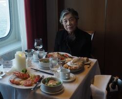 二日目 穏やかな日本海を境港へ 揺れは全くない 5時から船内アスレチックジムで一時間 8時 開放的なビュッフェレストラン<ボレロ>