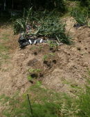 | 4 | 8 | 家から沢山の球根を持っていって植えた シュロの葉を上の方まで切った エンドウの種が残っていたので播いた 雑草とり ジャガイモまだ芽が出ない |
