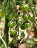 | 7月16日 暑い 9時30分から30分 暑くてやっておれない 一週間水なしなので水やりだけ 萎んでなかった 40センチほどになっていて 誘引棒がいる 自習畑でトマト30個ほど収穫 インゲンも元気 |