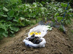 | 7 | 20 | このごろ良く雨が降る 水遣りの心配がなく良い 農楽会の自習畑でトマト・ナスとキュウリ少々収穫し その帰りに雨であったが寄る 雨降りで草は取れない ナス二本収穫 豆類順調 虫食いなし 豆の花2つか3つほど咲いている |