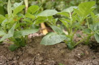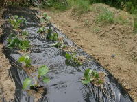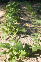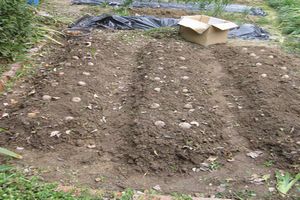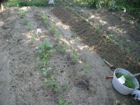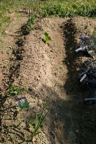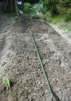 | ジャガイモを二列約20個植えた | エダマメの苗を10本と右の畝へ ジャガイモ10個 |
