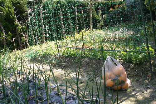 | 11月13日 スナップエンドウの種 二袋とタマネギの苗 9日に続いて50本植えた ピラカンサの枝をバッサリ切った ブロッコリーは痩せている 東の畑は11時で全面に陽が当たっている |
