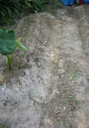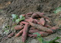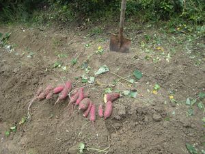 | サツマイモの試し掘り | サツマイモの葉を採ったあと石灰と 化成肥料入れ と手前ブロッコリー |