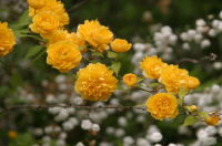 | ヤマブキの花が満開 | 手前がラッキョウ 後ろがサヤエンドウ |