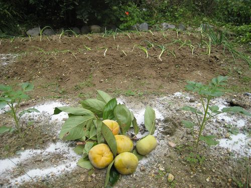 ジャガイモ 小玉を植えた | 甘夏の小木とゆず | 左=玉ねぎ50本追加 右=スナップエンドウとエンドウ |