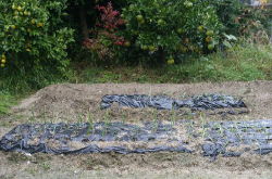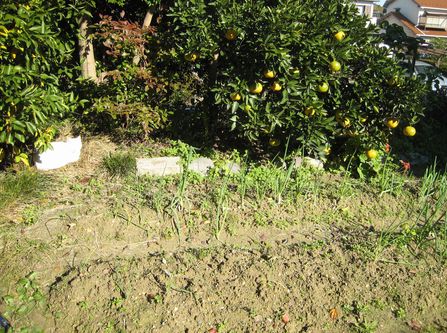 | 11月26日 マルチングして第二次玉ねぎ植え付け36本 みかん二次収穫 甘夏順調 北西の畝は楓の大木の影になり陽が当たらない 東は全面に陽が当たっている 第一次植え付けの玉ねぎは変化なし フロッコリー3本健在 |