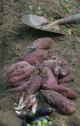 | 夏 | この夏雨がほとんど降らず サトイモは惨憺たる結果 水不足・肥料不足・酸性土を中和しなかった インゲンとなすはまあまあの結果 |