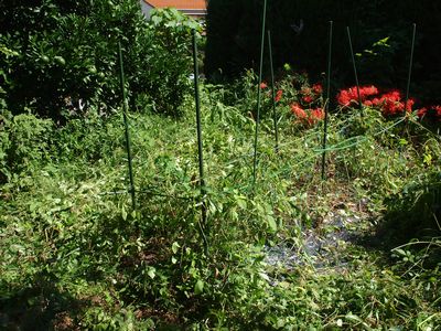 | 手前ジャガイモは収穫期 インゲン 誘引 フルーツトマト十数個収穫 |