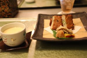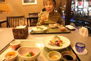 27階はデラックスルームフロアーで廊下も広い 食事はレストランで 和食は綺麗な盛り合わせ 旨い地酒を飲む