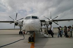 成田へは国内線のボンバルディーの50人乗りのプロペラ機 空港の端の方に駐機しており