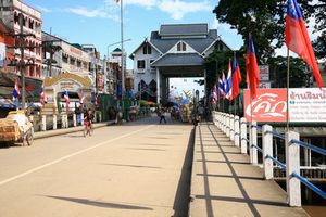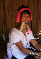 | 8月20日 6時 明るくなってきた バルコニーから川の向こうにミャンマーその向こうがラオス ここは三国が国境を接する ゴールデントライアングル地帯 以前は麻薬の売買で有名な所 カメラを持って出る 6時45分に折り返す ミャンマーへ出稼ぎに行く人のバイクが たくさん置いてある 明るいレストランでブッフェ朝食 種類は少なめだが上質 小象が来て一緒に写真を撮ったり 背中に乗ったりする ゴールデントライアングルクルーズ 長さ10メートルほどの高速ポートが茶色に濁った川面を飛ぶように進む ミャンマー側に立派なカジノが見える タイのバイクの青年はここで働いている様だ ラオスへフリーで入国 みやげ物店が十数軒ばかり軒を連ねている 物乞いの子どもがたくさん居る 大人も寄ってくる 着ているものは貧しい ここから学校までは10キロ以上あり この辺りの子は学校へは行って いない様子 ここに90分ほど居てまた高速艇に乗ってタイへ 往年の麻薬地帯の記録 麻薬博物館へ 煙管 麻薬を計る秤などの展示がしてあるが われわれ以外 人の気配が無い 外もみやげ物店は並んでいるが観光客の姿は無い 人の気配のない店で 往世が現地風のバッグを買う 店員のにっこりした笑顔は良いが 並んでいる商品はだれが買うのかと心配になってしまう 昼食後 チェンセンで二つの寺院を見学したあと 一時間ほど山道を行き 急な坂を下りると タイ北部の民族村 小屋風の土間で小学生風の子にチェンマイ大学の学生ボランティアが英語を教えていた ここで生まれた子は将来どうなるのだろう? その隣で カレン族の女性が何人か織物を売っている 我々が行ったら楽器の演奏をしてくれたが他にだれも居ない ここは自給自足で鶏が放してあり あちこちで自由に卵を産んでいるようだ 電気・水道は無く 水は大きなタンクに雨を貯めて使っている 静か 音がないところ チェンライ空港でガイドと別れ バンコクへ スパンナプーム空港は新しく立派 高速道路から見たバンコク市内は 高層ビルが立ち並び立派 宿泊のウエスティン・グランデ・スクーンピットは1Fの入口は地味だが7Fのホテルフロント は上品で静かな雰囲気 なかなか良い 夕食はチャオプラ川沿いのレストランで海鮮料理 美味しかったが ビール一本1000円は?