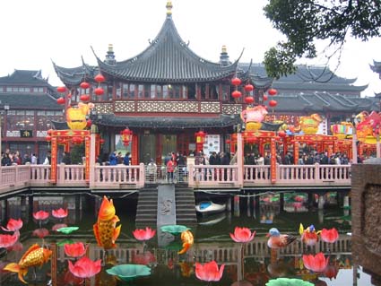 豫園の出入り口の前にある九曲橋のむこう 池の真ん中には