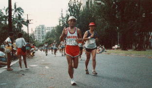 ホノルルマラソンはアラモアナの先がスタート地点。女性歌手によるアメリカ国歌が終わると,6時真っ暗の中を大砲一発スタートである。 ワイキキのあたりで明るくなる。この辺は道の両側に観光客が大勢で応援してくれるので嬉しい。 カピオラニ公園を通ってにダイヤモンドヘッドからは太平洋が一望でこのマラソンコースの中でも景色の良いところだ。 高級住宅地帯のあたりでは一家総出で応援してくれている。高速道路に入ると応援の人は少なくなりそろそろトップランナーが折り返してくる。 ホノルルマラソンがランナーに人気があるのは市民の温かい応援と,いつまででも待っていてくれるスタッフの人達が居るからだろう。 写真は左からゴール付近。カピオラニ公園でゴール後三々五々休んでいるもの。その右がメキシコオリンピック銀メダルの君原さんと。その右が完走者パーテイーで(青いシャツは完走記念シャツ) |