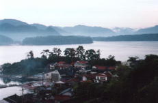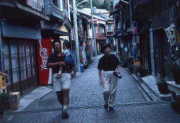 14時伊豆大島へ。16時40分着,ここは道も広く,信号もたくさんある。波浮港。昔,踊り子が通ったという昔ながらの街並を歩く(写真左)今晩の宿はカンポの宿。その前に、この島ではちょつと良い店ですしを食べる。翌朝5時,智樹のノックで起き、筆の形をした岩の筆島へ写真撮りに。太陽に向かって逆光で撮った。