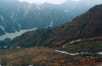 ケーブルカーで美女平へ。展望台は真っ白。高原バスで弥陀ヶ原へ近づくと視界が突然開け思わず歓声。見事に広がる紅葉。向こうに褐色の立山連峰を見る。人の少ないみくりヶ池のあたりを散策。トロリーバスで立山直下をトンネルで抜けて大観望へ。黒四ダムをはじめ北アルプスの2700M〜3000M級の山々が一望できた。(左画像)