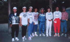 熱田神宮でゴールした人たち、左から 二人目が最強の男のH氏、その右から がA製鋼陸上競技部のお歴々 |
